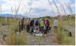 爽やかな秋晴れの下、南海高野線橋本駅に地質学の佐藤氏と部会員21名が集合。紀の川の河原の石ころ観察である。駅前の古い街並みを通り抜け、川沿いに約20分、橋本橋西詰の少し先まで歩く。河原への下り口は3年前と同様、背丈ほどの草むらになっていたが、先遣隊の草刈りにより無事、目的の河原に到着。北は和泉山脈、南は紀伊山地の山々、滔々と流れる紀の川の佇まいに心を和ませ、活動開始。先ずは佐藤氏による当地の石ころに関わる地質学的特徴のガイダンスの後、石ころの採取と分類となる。次いで、初めての試みとして、石ころの名前当てゲームに挑戦。各人が出題された河原の石ころ8個の鑑定結果を回答票に記入する。昼食の後、佐藤氏による鑑定の答え合わせと解説が行われ、成績の上位4名には記念の景品が贈られた。秋の陽ざしを存分に浴び、満ち足りた気分で河原を後にした。