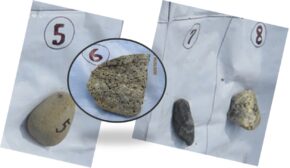 - ⑥流紋岩: 花崗岩のようにも見えるが、先の尖った対称性の高温型石英が見られることから流紋岩とみるべきだろう。成分的には両者同じであるが、冷却過程が違う。(写真参照:⑥の岩石にペンで〇をつけた)
