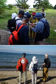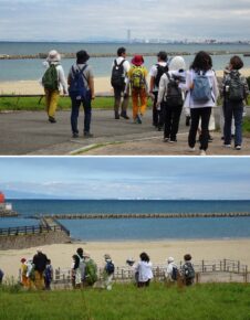 せんなん里海公園には、砂浜・礫浜・礫質海岸、崖地があり、様々な環境で育つ浜辺の植物観察に適しているそうです。淡輪駅から出発、はじめは山手の植物を見ている感じでしたが海に近づくと海岸特有の植物が増えてきました。日射、風、波、塩分・潮の干満による環境の影響を受け独自の形・生態の植物が多いそうです。