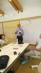 信太山丘陵里山自然公園の管理事務所に10時前に集合しました。 1年前位に新設され、こじんまりした公園に溶け込んでいる綺麗な建物でした。 先ずは講師より「和泉の自然」というパンフレットと「秋の昆虫・その他の動物記録表」が配布され、植物・昆虫・鳥・動物・外来種と整理された中身の説明をされました。 特にホタル・クビアカツヤカミキリの話に熱心だったように感じました。