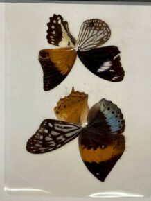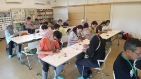 午後からは、蝶々の転写という皆さん初めての鱗粉転写の体験をしました。 先ずは15センチ角位の和紙2枚に蝋燭の蝋をしっかりとこすりつける作業をしました。 講師が採集していた蝶々の羽をはがし並び替えるのが非常に難しく、ク-ラ-の風で飛ぶので風向替えやら、せっかく並べたのに自分の吐く息でずれたりして大騒ぎでした。 やっと2枚の紙に挟み込み、上からスプ-ンでしっかりこすりつける転写作業に夢中になりました。あちこちで悲鳴に近い声も収まってきて、最後は講師にラミネ-トで仕上げをしてもらい綺麗な作品が出来上がりました。